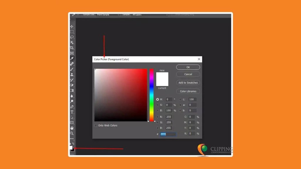 Our next task is to go to the color boxes and pick the color of the toolbar. At the bottom of the toolbar, you’ll see two overlapping squares. Here, the front part is the foreground swatch, and the back part is the background swatch. Click on the top square (foreground color) to open the Color Picker dialog box.