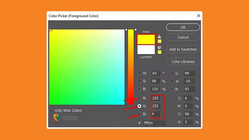 Quick Tip: For web use, you can also convert RGB values to Hex format. The above RGB (255, 255, 4) translates to the Hex code #FFFF04.